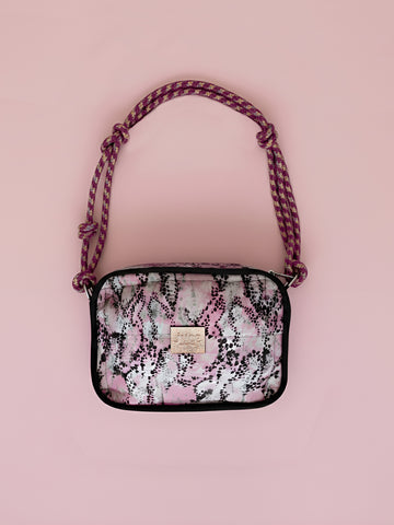 Avec son imprimé python rose , noir et écru, son biais contrasté et son matelassage, le sac Malicio sera l'allié de vos jours et de vos soirées. Pour un zeste de fun, il est entièrement doublé de coton imprimé liberty !